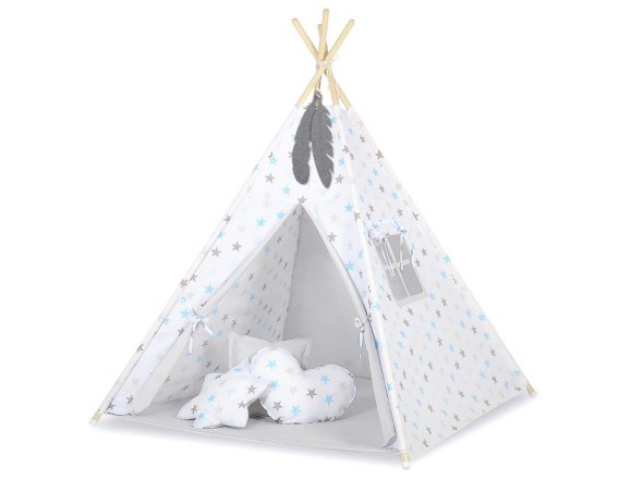 Namiot Tipi dla dzieci + zawieszki pióra - Gwiazdy szaro-niebieskie/szary