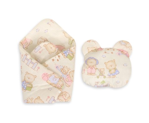Dodatkowo w komplecie zaokrąglona poduszka z uszkami, w kształcie głowy misia. Uroczy komplet do wspaniałej zabawy lalkami.