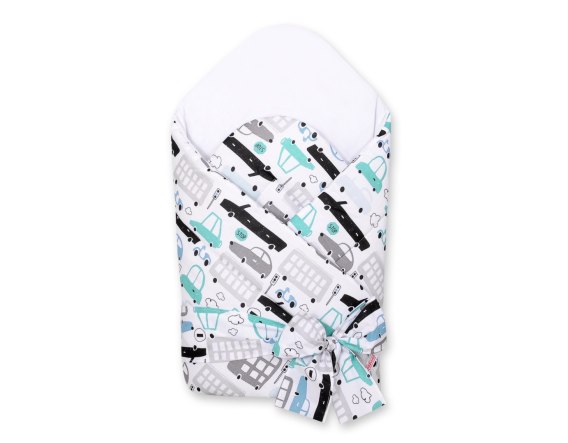 Rożek niemowlęcy 2w1 z wiązaniem i wyjmowanym usztywnieniem – pewne, miękkie otulenie dla noworodka, szaro-turkusowe auta